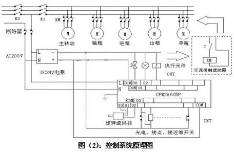 4.系統(tǒng)輸入回路中有光電開光和接近等開關(guān),PLC上的DC24V電源容量就不足了,各輸入、輸出元件均使用DC24V直流穩(wěn)壓電源。PLC控制系統(tǒng)原理圖見圖(2)。