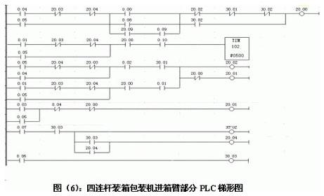 按照原有電氣控制系統(tǒng)輸入信號(hào)及輸出信號(hào)做為PLC的I/O點(diǎn),原來(lái)由繼電器硬件完成的邏輯控制功能由PLC軟件——梯形圖替代完成。圖(5)為四連桿裝箱包裝機(jī)進(jìn)箱臂部分電氣控制原理圖。圖(6)為轉(zhuǎn)換后的四連桿裝箱包裝機(jī)進(jìn)箱臂部分PLC程序梯形圖。進(jìn)箱臂部分主要I/O對(duì)照表如下:
