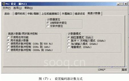 3.調(diào)試旋轉(zhuǎn)編碼器時(shí),A、B、Z相按說(shuō)明書接線,在PLC編程軟件中對(duì)編碼器的高速計(jì)數(shù)進(jìn)行設(shè)置,使用Z相加軟件復(fù)位方法。見圖(7)。按下按鈕5SA,使傳送帶電機(jī)停車時(shí),四連桿裝箱包裝機(jī)應(yīng)停止工作。