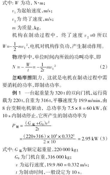 一臺是2×280t/60 t雙向門機,門架高33.5m,平移速度為19.9 m/min,由8臺變頻電機驅動,總功率為7.5×8 = 60 kW,由一臺Siemens 公司的6SE6440 變頻器集中驅動,功率為75 kW,變頻器的制動時間設置為10 s。