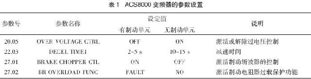 變頻器的幾個關鍵參數(shù)設置與控制系統(tǒng)是否選用制動單元有關,下面以ABB 公司ACS800變頻器參數(shù)設置為例做以對照,如表1 所列。
