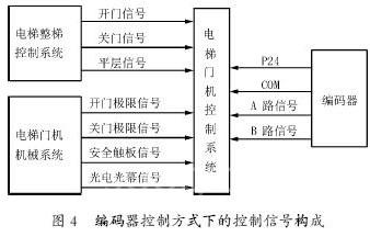 變頻門機(jī)的運(yùn)動(dòng)控制方式分為“編碼器控制方式”和“速度開關(guān)控制方式”。在使用“編碼器控制方式”時(shí),電機(jī)尾部安裝有編碼器,但上坎上不安裝速度開關(guān)。在這種控制方式下,通過編碼器既能檢測轎門位置,又能檢測轎門速度,因此可以使用位置和速度閉環(huán)控制,“編碼器控制方式”下的控制信號構(gòu)成如圖4所示。