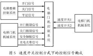 圖5跟圖4相比,只是編碼器信號用速度開關(guān)信號替代,其余控制信號二者完全一樣。兩個(gè)速度開關(guān)僅用作變頻門機(jī)運(yùn)動(dòng)過程中的速度切換點(diǎn)。