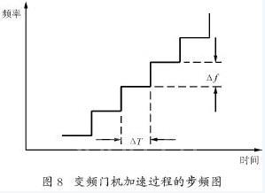 在圖6 與圖7 中,加速段與減速段的理想曲線都是連續(xù)的,但實(shí)際施加的速度信號是不連續(xù)的,而是通過步頻來實(shí)現(xiàn)的,步頻的概念請見圖8,現(xiàn)以加速過程來說明步頻的概念。圖8 是從加速段理想曲線中選一小段放大,從圖中可以看出,放大后呈階梯狀,在加速過程中,速度的增加是通過間隔時(shí)間駐T來增加頻率駐f(電機(jī)電源頻率)實(shí)現(xiàn)的,駐f稱為步頻。在設(shè)計(jì)理想曲線時(shí),要先計(jì)算出加速過程需要多少時(shí)間,從而計(jì)算出步頻的具體數(shù)值。步頻的數(shù)值是頻率分辨率的整數(shù)倍,比如對于頻率分辨率為0.1 Hz的變頻門機(jī)系統(tǒng),步頻的數(shù)值可為0.3 Hz、0.4 Hz 等,具體數(shù)值由設(shè)計(jì)者根據(jù)實(shí)際情況確定,步頻的數(shù)值不能太大,否則在加減速時(shí)會(huì)出現(xiàn)振動(dòng)。