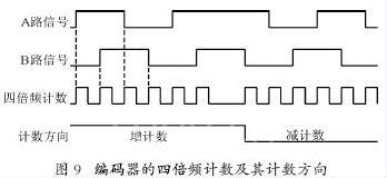 從圖9 可看出,編碼器輸出的A 路信號和B路信號為相位差90°的周期方波信號,在DSP(或單片機(jī))芯片內(nèi)部有專門用于編碼器信號計(jì)數(shù)的 90°相移計(jì)數(shù)器,當(dāng)A路信號的上升沿/下降沿超前B路信號的上升沿/ 下降沿時(shí),計(jì)數(shù)器的計(jì)數(shù)方向?yàn)樵鲇?jì)數(shù);當(dāng)A路信號的上升沿/下降沿滯后B路信號的上升沿/ 下降沿時(shí),計(jì)數(shù)器的計(jì)數(shù)方向?yàn)闇p計(jì)數(shù)。若設(shè)定增計(jì)數(shù)時(shí)電機(jī)的運(yùn)動(dòng)方向?yàn)檎较颍瑒t減計(jì)數(shù)時(shí)電機(jī)的運(yùn)動(dòng)方向就為反方向。