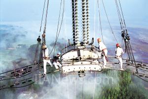 1981年,平武輸變電工程投運(yùn)。圖為湖北超高壓輸變電公司員工在平武線所經(jīng)漢江中山口大跨越鐵塔上進(jìn)行檢修