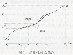 0 引言 智能儀表的模擬輸入通道一般由傳感器、前置放大電路、有源濾波器、采樣保持電路(S/H)、A/D轉(zhuǎn)換器和微機(jī)系統(tǒng)等電路組成[1]。由于電子元器件性能參數(shù)的離散性、穩(wěn)定性和溫度敏感性等問題,目前還得不到根本的解決。因此,從傳感器到A/D 轉(zhuǎn)換之間的任何一個(gè)環(huán)節(jié)都存在非線性的問題,使得A/D轉(zhuǎn)換值n與被測量x不成線性關(guān)系,即n≠ax+b(a、b為常數(shù))[2]。如果不解決這種非線性問題,將會嚴(yán)重影響智能儀表的測量精度。常用的非線性校正方法有校正函數(shù)法、查表法和模型校正法[s]。 ① 校正函數(shù)法要求傳感器的輸入/輸出特性能用數(shù)學(xué)解析式表示,且輸入通道的其它環(huán)節(jié)可認(rèn)為是線性的。事實(shí)上,很多傳感器的輸入/輸出特性很難用解析式表示,并且如果解析式計(jì)算太復(fù)雜,還會嚴(yán)重影響測量速度。因此,校正函數(shù)法的應(yīng)用受到較大的局限[4]。 ② 查表法必須針對每一個(gè)傳感器進(jìn)行校正,而且需要把大量的校正數(shù)據(jù)制成表格存入儀表內(nèi)存。而一般的智能儀表的內(nèi)存非常有限;當(dāng)因故更換傳感器時(shí),需要重新校正、修訂內(nèi)存中的表格數(shù)據(jù),應(yīng)用起來也非常不方便[5]。 ③ 模型校正法的基本原理是設(shè)法找到一個(gè)近似函數(shù)g1(x)或多個(gè)分段近似函數(shù)g1(x)、g2(x)、g3(x)、g4(x)等來代替原函數(shù)f(x)。模型校正法的關(guān)鍵是如何求出既能滿足精度要求,又能滿足計(jì)算簡單的校正模型。通常校正模型計(jì)算太復(fù)雜會影響測量速度,所以采用模型校正法進(jìn)行非線性校正時(shí),往往采用離線處理的方式[6]。 智能儀表的特點(diǎn)是:采用的微控制器通常不便于進(jìn)行復(fù)雜的計(jì)算,內(nèi)存也非常有限,而且很多情況下實(shí)時(shí)性要求高,不允許離線校正。因此,尋找到一種簡便、有效、通用的非線性自動校正方法,具有非常重要的意義。 1 非線性自動校正算法 采用分段直線方程的非線性校正原理如圖l所示。設(shè)儀表的被測量用X表示,儀表中對應(yīng)的燈D轉(zhuǎn)換值用N表示,則曲線OM表示儀表的非線性特性曲線?,F(xiàn)將曲線分成若干段,如果分段點(diǎn)的位置和分段數(shù)選取合適,則每一段曲線可近似看成是一直線段。這樣,曲線OM就可看成是由若干直線段組成。如圖中虛線段AB、BC可分別近似表示曲線AB和曲線BC。