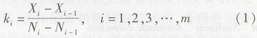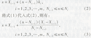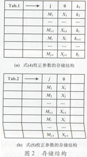 圖1中:曲線OM分段后各段端點(diǎn)對應(yīng)的被測信號分別為X0, X1,X2,…,Xi-1, Xi, Xi+1,…,Xm;儀表中對應(yīng)的A/D轉(zhuǎn)換值分別為N0, N1, N2,…,Ni, Ni+1, … ,Nm。其中,x0為被測量的最小值,Xm為被測量的最大值。顯然線段AB的斜率為:  曲線段AB上的點(diǎn)(n,f(n)),可用直線段AB上的點(diǎn)P(n,x)近似表示,而點(diǎn)P滿足:  式(2)、式(3)就是得到的分段直線校正方程。其中式(2)可稱為點(diǎn)斜式校正方程,因?yàn)樾U匠逃删€段上的端點(diǎn)(從Ni-1,Xi-1)和斜率ki決定;式(3)可稱為兩點(diǎn)式校正方程,因?yàn)樾U匠逃删€段上的兩端點(diǎn)(Ni-1, Xi-1)和(Ni,Xi)決定。 在校準(zhǔn)時(shí),若采用點(diǎn)斜式校正方程,則依次把校正方程參數(shù)(Ni-1,Xi-1)和ki(其中i=1,2,3,…,m)存入儀表的內(nèi)存;若采用兩點(diǎn)式校正方程,則依次把校正方程參數(shù)(Ni,Xi)(其中i=0,1,2,3,…,m)存入儀表的內(nèi)存。在實(shí)際測量時(shí)只要先用程序判斷儀表當(dāng)前的A/D轉(zhuǎn)換值N位于哪一個(gè)直線段,再從儀表內(nèi)存中取出相應(yīng)直線段的校正方程參數(shù),則可由校正方程求出相應(yīng)的測量值X。 從校正方程可以看出,測量值只與校正點(diǎn)的測量數(shù)據(jù)有關(guān),而與包括傳感器在內(nèi)的模擬輸入通道的各環(huán)節(jié)的非線性并無直接關(guān)系。因此,只要儀表的重復(fù)性或穩(wěn)定性較好,即在不同時(shí)刻測量同一被測量X時(shí),得到的A/D轉(zhuǎn)換值N始終或基本保持不變,不論非線性是由于傳感器還是因?yàn)槟M輸入通道的其它環(huán)節(jié)引起的,都可以達(dá)到非線性校正的目的,從而保證儀表的測量精度。理論上講,分的段數(shù)越多,儀表的測量精度就越高,但相應(yīng)地,占用儀表的內(nèi)存也越多,測量速度也會有少許影響,校準(zhǔn)時(shí)也會稍微復(fù)雜。 需要指出的是,各種智能儀表存在較大的差異,實(shí)際應(yīng)用中要視具體情況對非線性校正方程進(jìn)行必要的修正。 2 在稱重儀表中的應(yīng)用 在電子衡器中,廣泛采用的稱重傳感器是壓力或拉力傳感器。不論傳感器的量程多大,其滿度輸出一般為2mV左右,因此,對于同一種類型(靜態(tài)或動態(tài))的電子衡器而言,往往可以采用通用的稱重儀表。 電子衡器尤其是商用電子衡器,不僅對稱重精度有很高的要求,而且對實(shí)時(shí)性也有較高的要求。因此,稱重儀表的非線性校正必須采用在線方式。 2.1 非線性自動校正方程的修正 在稱重儀表中,最小測量值x0=0kg,對應(yīng)的零點(diǎn)值N0≠0,而且會隨著環(huán)境溫度的變化而變化,實(shí)際測量時(shí),各校正點(diǎn)Xi對應(yīng)的A/D轉(zhuǎn)換值Ni(i=1,2,3,…)也會因零點(diǎn)的變化而相應(yīng)發(fā)生變化。也就是說,環(huán)境溫度變化后,實(shí)際測量時(shí),當(dāng)被測量為 Xi時(shí),儀表內(nèi)部獲取的A/D轉(zhuǎn)換值不再是校正時(shí)的Ni,從而使得按上述校正方程式(2)或式(3)求取的測量校正值是錯(cuò)誤的或不準(zhǔn)確的。 實(shí)驗(yàn)證明,稱重儀表的零點(diǎn)值N0受環(huán)境溫度的影響較大,而其非線性特性曲線受環(huán)境溫度的影響較小[7]。如圖1中所示,N0發(fā)生變化后,可以近似認(rèn)為非線性特性曲線OM只是適當(dāng)左移或右移。也就是說,盡管N0是變化的,而Ni-N0(i=1,2,3,… )可以認(rèn)為是不變的。 一般來說,每天的不同時(shí)刻都會存在一定的溫差,但每天的溫度變化都非常緩慢,稱重儀表的零點(diǎn)在使用過程中的變化也非常緩慢。根據(jù)這個(gè)特點(diǎn),我們完全可以用軟件的方法實(shí)現(xiàn)零點(diǎn)跟蹤,即在某個(gè)較短的時(shí)間段(如0.5s)內(nèi),若采樣到的A/D值n與之前的零點(diǎn)N0之差的絕對值不超過某個(gè)較小的數(shù)值,則令N0=n。 鑒于儀表的零點(diǎn)值N0受環(huán)境溫度的影響較大,非線性校正方程要作相應(yīng)的修正:不管是校正時(shí)還是實(shí)際測量時(shí),均把得到的A/D轉(zhuǎn)換值減去零點(diǎn)值N0。此時(shí),點(diǎn)斜式校正方程修正為:  2.2 校正方程參數(shù)的存儲結(jié)構(gòu) 對于點(diǎn)斜式校正方程式(4)而言,要存入儀表內(nèi)存的校正方程參數(shù)為:Mi-1、Xi-1和ki(i=l,2,3,…m;M0=X0=0),可用一個(gè)三維數(shù)組形式的表格存放。 對于兩點(diǎn)式校正方程式(5)而言,要存入儀表內(nèi)存的校正方程參數(shù)為:Mi、Xi(i=0,1,2,3,…,m;M0=x0=0),可用一個(gè)二維數(shù)組形式的表格存放。 考慮到M0=x0=0,故M0和X0不必保存,但應(yīng)在表首位置存儲校正點(diǎn)數(shù)j。兩個(gè)校正方程的校正參數(shù)在儀表內(nèi)存中的存儲結(jié)構(gòu)分別如圖2所示,其中Tab.l和Tab.2分別表示內(nèi)存參數(shù)表首地址。