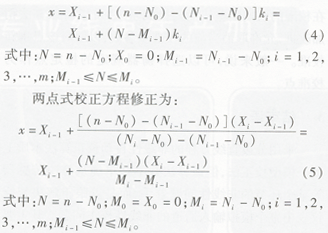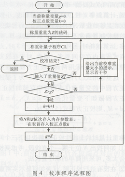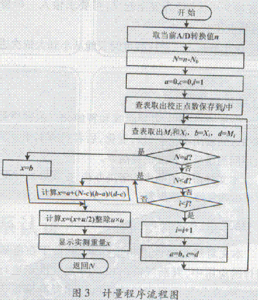 2.3 非線性自動校正 從兩個(gè)校正方程可以看出,點(diǎn)斜式只要做一次乘法運(yùn)算,而兩點(diǎn)式要做一次乘法運(yùn)算和一次除法運(yùn)算??紤]到:計(jì)算斜率ki時(shí),為了保證測量精度,小數(shù)點(diǎn)后需要保留足夠的位數(shù),視具體情況而定;而智能儀表中采用的微控制器通常不方便做小數(shù)乘法運(yùn)算,而且位數(shù)越多、運(yùn)算越耗時(shí);另外,當(dāng)分段數(shù)大于3時(shí),點(diǎn)斜式比兩點(diǎn)式所需內(nèi)存空間要多。因此,對于在線實(shí)時(shí)校正的智能儀表來說,采用兩點(diǎn)式校正方程往往更合適一些。這里選用式(5)作為校正方程。為了描述時(shí)區(qū)分校正方程中的變量和儀表內(nèi)存中存儲的校正參數(shù),對校正方程做如下變量代換,令a=Xi-1,b=Xi,C=Mi-1,d=Mi,則校正方程式(5)變?yōu)椋?BR> 稱重計(jì)量時(shí)的非線性校正要解決以下三個(gè)問題。 ①如何找出N位于哪一個(gè)直線段,考慮到校正點(diǎn)數(shù)不會太多,可采用簡單的順序查找法。 ②在沒有進(jìn)行校正前,儀表如何顯示實(shí)測重量。 按全量程線性處理,即把量程的最大值Xm作為唯一校正點(diǎn),但校正點(diǎn)數(shù)j記為0,表示未進(jìn)行過校正。因此,儀表內(nèi)存參數(shù)表初始化時(shí),j處保存0、M1處保存Nm-N0、X1處保存Xm和Xm是可以預(yù)知的,而N0也可以估算出來或通過實(shí)測獲得。 ③當(dāng)實(shí)際稱量物體的重量超過最大校準(zhǔn)點(diǎn)重量時(shí),儀表如何顯示實(shí)測重量。 按最大校準(zhǔn)點(diǎn)求得的校正參數(shù)進(jìn)行校正。因此,稱重儀表(電子衡器)稱重計(jì)量和校準(zhǔn)時(shí)的非線性自動校正程序流程分別如圖3和圖4所示。