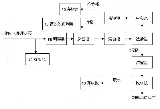 第二類工業(yè)廢水包括鍋內(nèi)取樣廢水、鍋爐清洗廢水、鍋爐排污水、空預(yù)器沖洗水,煤場(chǎng)廢水等,貯存在#1-4和#6存放池中,處理工藝流程圖為: