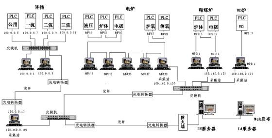 萊鋼特殊鋼廠二煉車間建于2000年,具有50T電爐、50T精煉爐、VD爐、合金鋼連鑄機及其他水、汽等輔控設(shè)備。設(shè)備生產(chǎn)數(shù)據(jù)往往分散在不同的計算機或控制系統(tǒng)上,不能進行統(tǒng)一的存儲、調(diào)用和管理,各個控制系統(tǒng)是互不相連的自動化孤島,許多問題因無法采集到足夠的數(shù)據(jù)進行綜合分析而難以得到合理快捷的解決方法,因此廠方設(shè)計通過PLC建立全廠專業(yè)級實時數(shù)據(jù)庫,完成全廠生產(chǎn)過程數(shù)據(jù)的采集、存儲及Web發(fā)布?!?/FONT>