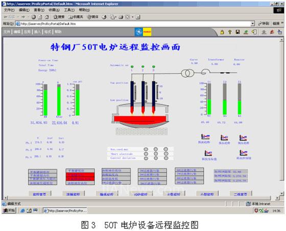 基于Web的infoAgent軟件是一個智能化的過程數(shù)據(jù)分析平臺,它是遠程監(jiān)視與診斷系統(tǒng)的數(shù)據(jù)發(fā)布部分,通過它可直觀的顯示設(shè)備流程圖、各設(shè)備的狀態(tài)及各節(jié)點的數(shù)據(jù)。用戶可在流程圖中對各子系統(tǒng)的運行狀態(tài)進行最直觀的監(jiān)視,以50T電爐為例,如圖3: