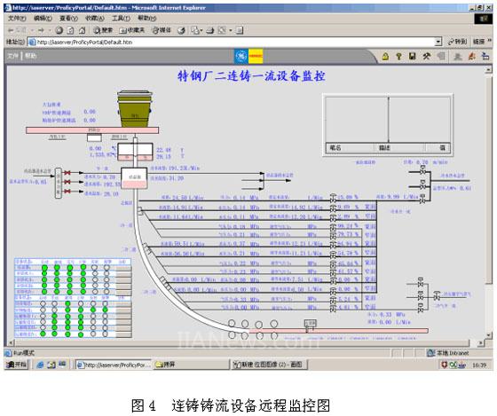 合金鋼連鑄機部分主要分鑄流與公用兩大部分。鑄流設(shè)備遠程監(jiān)控圖如圖4。鑄流部分的一冷段水汽、二冷段水汽、拉矯機狀態(tài)、運輸輥道狀態(tài)等信息均在畫面上作了顯示。