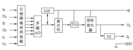 三相交流輸入信號經(jīng)三相隔離采樣電路后,形成三相電流、三相電壓信號的共地跟蹤電壓信號,在單片機控制下由A/D轉(zhuǎn)換器對其進行多點同步采樣,采樣得到的數(shù)據(jù)由DSP器件按電工原理計算出被測信號的三相有功功率(數(shù)字量),再經(jīng)D/A轉(zhuǎn)換器把代表三相功率的數(shù)字信號轉(zhuǎn)換為模擬量,由定標放大器放大、定標后,形成直流電壓輸出VZ;VZ輸出經(jīng)專用厚膜集成V/I變換器后形成0~20mA或4~20mA直流電流輸出IZ。