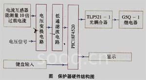 該保護器的硬件結構,如下圖所示。主要包括信號采集模塊、鍵盤輸入模塊、顯示模塊和執(zhí)行模塊等。采樣模塊首先對電動機的電流與電壓信號進行采集,然后將采集到的模擬信號通過電平轉換電路和低通濾波器濾去高次諧波,最后進入PIC18F4520的ADC進行數(shù)字化處理得到電流和電壓離散值。鍵盤輸入模塊主要用于設定欠功率、過電壓、欠電壓和過電流等各項保護判據(jù),涉及的報警整定值、跳閘整定值或其他設定參數(shù),也是通過鍵盤來實現(xiàn)的。顯示模塊主要用于顯示電流和電壓等參數(shù),采樣3排四位數(shù)碼管顯示模塊。執(zhí)行模塊主要是用于輸出各種控制信號來執(zhí)行相應的動作,當發(fā)生故障時,執(zhí)行模塊就會執(zhí)行相應的動作使繼電器有所動作,達到對電動機的保護。