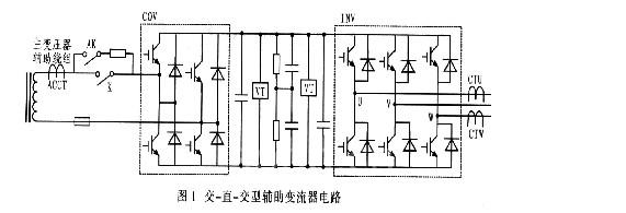 (1)采用交一直一交型輔助變流器,必須在牽引變壓器上增加輔助繞組給逆變器供電,因此系統(tǒng)對機車主電路的要求較高。但由于系統(tǒng)只需要進行交一直、直一交兩個環(huán)節(jié)的變換,開關器件的額定電壓低,所以器件數(shù)量少、成本低,整個系統(tǒng)效率高,技術實現(xiàn)較容易。