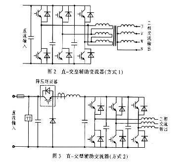 (2)采用直一交型輔助變流器,可省去輔助繞組,提高機車再生制動時的能量利用率。其中:①對于中間環(huán)節(jié)電壓不是很高的系統(tǒng)(一般不超過2 000 V),可直接利用逆變器進行逆變,然后再經(jīng)降壓變壓器降壓。這種結(jié)構(gòu)中間環(huán)節(jié)少、控制簡單、開關器件少,系統(tǒng)的效率較高。但由于開關器件電壓等級較高,基于降低能耗考慮,其開關頻率會受到限制,因此輸出電壓波形不會很理想,而且降壓變壓器也會使機車增加額外重量,增加成本。②對于中間環(huán)節(jié)電壓超過2 000 V的,一般采用直一直變換,中間電壓600V左右,然后進行逆變。這種結(jié)構(gòu)在直一直變換環(huán)節(jié)比較復雜,器件多、電壓等級較高,還需要增加脈沖變壓器進行隔離,因此系統(tǒng)復雜、效率較低。