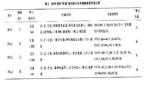 在機車輔助電源系統(tǒng)中,機車直流電源系統(tǒng)比較簡單,在進行輔助電源系統(tǒng)比較時主要進行三相交流輔助電源系統(tǒng)的比較。表2歸納了國產(chǎn)交一直傳動韶山7E(簡稱SS7E)型電力機車和交一直一交傳動HXD1、HXD2、HXD3 三種型號的“和諧”系列電力機車的輔助電源系統(tǒng)。