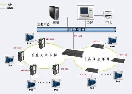 在變電站之間組建光纖傳輸網(wǎng)絡(luò),通過工業(yè)以太網(wǎng)交換機將各個變電站與主控中心相連。整個光纖傳輸網(wǎng)絡(luò)由2個環(huán)網(wǎng)組成,是EVS組成的千兆環(huán)網(wǎng)與EVS百兆環(huán)網(wǎng)。每個變電站配置1臺工業(yè)以太網(wǎng)交換機,同時在主控中心配置1臺網(wǎng)管型EVS-0622工業(yè)以太網(wǎng)交換機匯聚千兆環(huán)網(wǎng)與百兆環(huán)網(wǎng)的傳輸數(shù)據(jù),以便于擴容備份千兆光通路。