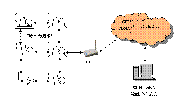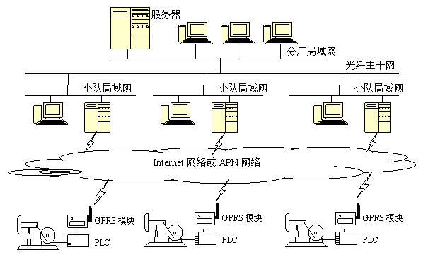 ②PLC與監(jiān)控中心通訊方式:采用無線通訊技術(shù)(GPRS/CDMA、數(shù)傳電臺(tái)、ZigBee模塊);在單口油井應(yīng)用情況下我們提供gprs組網(wǎng)方案,利用移動(dòng)網(wǎng)gprs或cdma與遠(yuǎn)端的數(shù)據(jù)中心計(jì)算機(jī)相連。在多口油井應(yīng)用情況下我們提供Zigbee組網(wǎng)方案。首先,使用Zigbee在臨近的油井間建立起一個(gè)局部無線網(wǎng)(Zigbee控制網(wǎng)內(nèi)節(jié)點(diǎn)終端間通訊是免費(fèi)的),再通過移動(dòng)網(wǎng)gprs或cdma與遠(yuǎn)端的數(shù)據(jù)中心計(jì)算機(jī)相連,從而實(shí)現(xiàn)低成本,高效率的工業(yè)自動(dòng)化遠(yuǎn)程無線通訊。