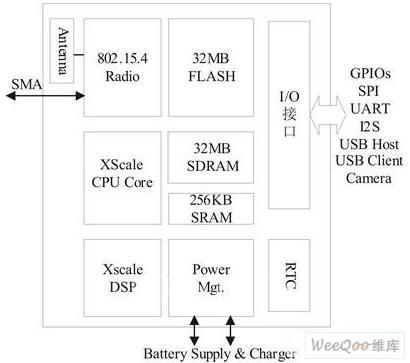 在設計無線傳感器網(wǎng)絡網(wǎng)關時,需要較強的數(shù)據(jù)處理能力,用以實現(xiàn)復雜路由協(xié)議以及信息處理等。如圖5所示Crossbow的imote2節(jié)點采用了Marvell PXA271 高性能、低功耗處理器。該處理器使用動態(tài)電壓調節(jié)技術,頻率范圍13MHz~416MHz,可工作于低電壓(0.85V)低頻率(13MHz)模式,具備了優(yōu)良的動態(tài)電源管理技術。此外,該處理器封裝內集成三個芯片256KB SRAM,32MB FLASH以及32MB SDRAM,減小了體積。通過提供多種I/O,能夠靈活的支持不同種類的傳感器。該處理器還支持一個MMX協(xié)處理器,提高多媒體處理能力,可以用于無線多媒體傳感器網(wǎng)絡中的語音和圖像處理。Imote2使用TI的CC2420 ZigBee射頻芯片,支持2.4GHZ 、16通道250kb/s數(shù)據(jù)傳輸,發(fā)送功率-24~0dBm。有效通訊距離是30米,可以通過SMA接口外接天線來增加傳輸距離。
