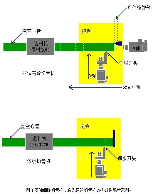 雙軸伺服切管機(jī)核心的部分是兩軸伺服的循環(huán)配合動(dòng)作,一軸為拖板軸向軸,另一軸為切刀切向軸,拖板軸向軸主要是做圈長(zhǎng)定位用的,(a)當(dāng)軸向往管的方向走的時(shí)候,當(dāng)定位傳感器碰到管的頭部的時(shí)候就確認(rèn)管的位置,進(jìn)PLC硬件中斷,進(jìn)行脈沖禁止,然后再根據(jù)切管的長(zhǎng)度做一個(gè)補(bǔ)償定位;(b)定位完畢切向切刀進(jìn)行切管,切管完畢;軸向繼續(xù)前進(jìn)重復(fù)a,b的動(dòng)作,直至切到管子送料的末端,也就是極限位置,軸向退回,然后送料,送料完畢,重復(fù)a,b動(dòng)作,這就是雙軸伺服切管的最基本的動(dòng)作流程。雙軸伺服切管機(jī)與普通切管機(jī)的機(jī)械構(gòu)架如圖1所示。