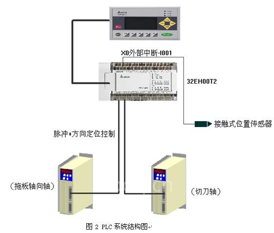 由于使用了雙軸伺服控制,所以方案中使用的是32EH00T2型PLC主機(jī)做定位控制,同時(shí)利用中斷方式來(lái)實(shí)現(xiàn)軸向定位的切換。由于使用的是接觸式傳感器(X0)外部中斷來(lái)做脈沖禁止,然后切換到長(zhǎng)度定位,同時(shí)使用的是絲桿傳導(dǎo),所以精度問(wèn)題可以保證(0.1mm以?xún)?nèi)),具體的PLC系統(tǒng)如圖2所示;控制工藝流程如圖3所示。
