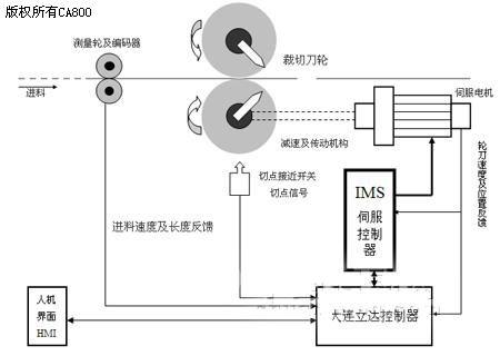 下圖為電腦螺旋刀橫切機(jī)控制簡圖。此系統(tǒng)實(shí)現(xiàn)旋轉(zhuǎn)式同步動態(tài)裁切,上下兩組裁切輪刀同時(shí)被伺服馬達(dá)帶動,各依箭頭所示方向相對旋轉(zhuǎn)。輪刀之上的刀刃必須作精密的調(diào)整,當(dāng)上輪刀之刀刃旋轉(zhuǎn)至正下方時(shí),下刀刃恰好轉(zhuǎn)至正上方,才能執(zhí)行正確的裁切。每次裁切刀輪旋轉(zhuǎn)一圈,便自動將材料切斷一次;馬達(dá)只要在相同方向連續(xù)運(yùn)轉(zhuǎn),輪刀便能連續(xù)裁切。