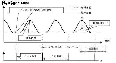 6. 進(jìn)入同步區(qū)域之后,裁刀速度必須隨時(shí)與進(jìn)料速度維持同步運(yùn)轉(zhuǎn),直到第二個(gè)裁切點(diǎn)出現(xiàn),乃完成一次裁切循環(huán)。