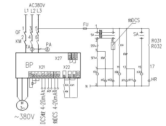 風(fēng)機(jī)電機(jī)控制方式為手動(dòng)/自動(dòng)兩種操作方式,手動(dòng)方式時(shí),可以在設(shè)備現(xiàn)場(chǎng)控制箱上啟、停風(fēng)機(jī),使用電位器調(diào)節(jié)風(fēng)機(jī)轉(zhuǎn)速,自動(dòng)方式時(shí),在控制室DCS控制系統(tǒng)計(jì)算機(jī)上啟、停風(fēng)機(jī),調(diào)節(jié)風(fēng)機(jī)轉(zhuǎn)速??刂圃韴D一所示。