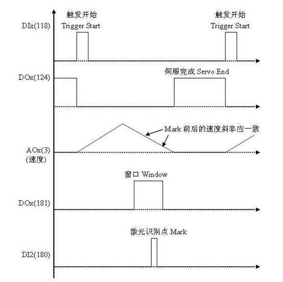要求在把一段鋼板送到切刀口進行定長定位的裁切。傳送鋼板裝置是由一個伺服驅(qū)動器和一個伺服電機驅(qū)動。有的鋼板上也可能裝有標識(追標功能)。在標識附近設(shè)定檢測區(qū)域,設(shè)定為“窗口”區(qū)域。