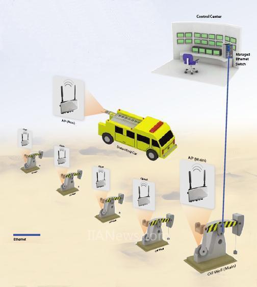 每個油井均采用數(shù)個傳感器收集信息,傳感器通過基金會現(xiàn)場總線連接。為了使用標準以太網(wǎng)進行通信,基金會現(xiàn)場總線網(wǎng)關(guān)將基金會現(xiàn)場總線數(shù)據(jù)轉(zhuǎn)換為標準以太網(wǎng)格式。其他安全系統(tǒng),如消防警報與監(jiān)控系統(tǒng)也通過以太網(wǎng)連接。每個油井與控制中心之間使用無線通信系統(tǒng)??紤]到可靠性,使用不同頻段的雙無線網(wǎng)絡(luò)進行傳輸,冗余滿足IEEE 802.1 w RSTP協(xié)議標準。由于油井之間的距離總是在500m至1km之間,需要使用特殊天線與網(wǎng)格標準如WDS進行遠距離通信。