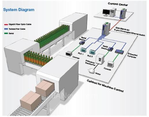 一家世界領(lǐng)先的機械制造商,專業(yè)從事計劃、開發(fā)、制造、安裝機械設(shè)備。正進行灌裝、貼標(biāo)及封裝生產(chǎn)線的開發(fā)制造。作為一家以太網(wǎng)控制機械自動化的創(chuàng)新者,公司正在擴展他們的機械集成方案,通過在單個機械或者機組中植入工業(yè)網(wǎng)絡(luò),力圖為機械控制行業(yè)樹立典范。他們最初的方案之一是組裝一條由三種主要機器構(gòu)成的軟飲料瓶生產(chǎn)線,包括灌裝機、貼標(biāo)機和封裝機。該公司想要找到頂尖級別、符合工業(yè)應(yīng)用強度的以太交換機,為此生產(chǎn)線線及其他產(chǎn)品生產(chǎn)線組成“內(nèi)部網(wǎng)絡(luò)”。