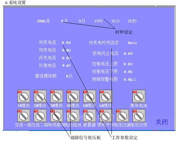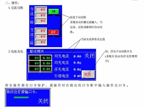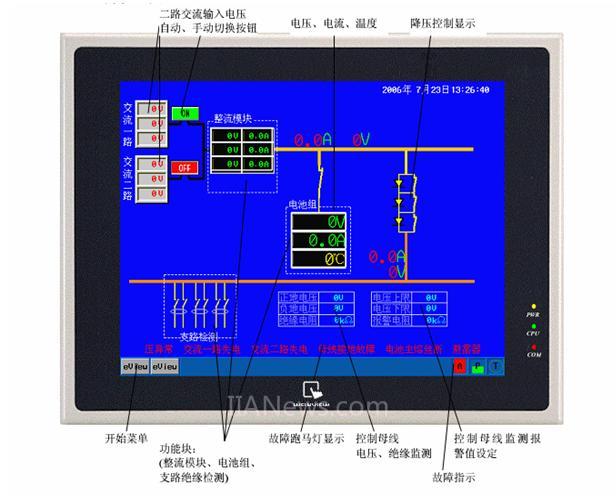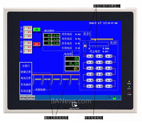 監(jiān)控系統(tǒng)包括主監(jiān)控器、電池巡檢儀、操作界面、支路饋線絕緣檢測傳感器等部份組成。功能完備、智能控制、無人值守,有自動化綜合管理接口。7.7英寸 彩色 DSTN 液晶屏、640 × 480 像素。數(shù)據(jù)記錄、掉電保持。
