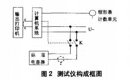 根據(jù)電容原理擬定測試儀由計算機系統(tǒng)、鉗形表傳感器、標準電容修正系統(tǒng)、電壓輸出單元組成,如圖2所示,該裝置整體重量不足3kg,適合現(xiàn)場攜帶。