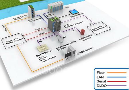 Moxa IA260有8+8 路DI/DO控制on/off開關系統(tǒng)、入侵檢測及報警燈光系統(tǒng)。另外,某些DI/DO可保留以備后續(xù)使用。雙LAN端口(一個固定IP,一個可配置端口)允許數(shù)據(jù)從PLC向以太網(wǎng)交換機傳輸數(shù)據(jù),然后交換機將數(shù)據(jù)傳送至SCADA系統(tǒng)。另外,一個緊湊閃存插槽和額外串行接口(4個串行端口)可用于以后的存儲擴展及使用。