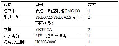 研控公司4軸控制器PMC400是一款基于ARM與FPGA芯片的控制器,運(yùn)算速度的提升、系統(tǒng)思想的應(yīng)用以及彈簧機(jī)專有算法的改進(jìn)使得客戶公司的步進(jìn)系列壓簧機(jī)性能有了很大的提高。在動力部分選型時根據(jù)客戶公司彈簧機(jī)特點(diǎn)選用了如下表一中的一套配置:
