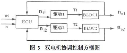 要判斷駕駛員的駕駛意圖是直駛還是轉(zhuǎn)向,方向盤轉(zhuǎn)角θ是一個重要參數(shù)。策略中引入方向盤自由行程角ε這樣一個標(biāo)志量,當(dāng)|θ| > ε 時,車輛電控單元(ECU)認(rèn)為駕駛意圖為轉(zhuǎn)向,否則為直駛。無論是直駛控制策略還是轉(zhuǎn)向控制策略,其關(guān)鍵點還是通過對目標(biāo)轉(zhuǎn)速ni1和ni2的調(diào)節(jié)來實現(xiàn)對兩側(cè)電機的控制,從而達到對車體行走軌跡的操控。雙電機協(xié)調(diào)控制方框圖見圖3。