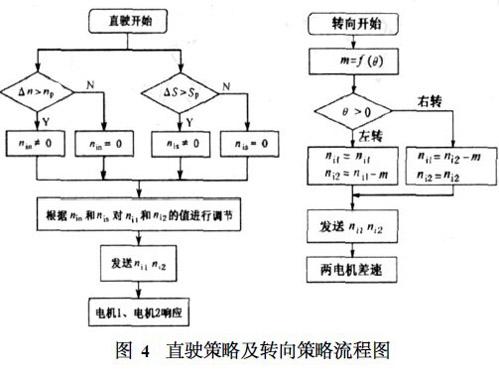 轉(zhuǎn)向控制時, ECU根據(jù)方向盤轉(zhuǎn)角θ的絕對值大小計算兩側(cè)電機的目標(biāo)轉(zhuǎn)速差m, 根據(jù)θ的正負(fù),確定驅(qū)動系統(tǒng)中的兩個電機誰為外側(cè)電機和誰為內(nèi)側(cè)電機,外側(cè)電機的目標(biāo)轉(zhuǎn)速保持當(dāng)前速度不變,而內(nèi)側(cè)電機的目標(biāo)轉(zhuǎn)速則應(yīng)當(dāng)在當(dāng)前目標(biāo)轉(zhuǎn)速的基礎(chǔ)上下調(diào)m,從而實現(xiàn)轉(zhuǎn)向。圖4為直駛和轉(zhuǎn)向的控制流程圖。