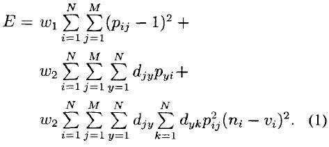 關(guān)鍵詞:無(wú)線傳感器網(wǎng)絡(luò);廣播調(diào)度問(wèn)題;Hopfield神經(jīng)網(wǎng)絡(luò);圖著色 1 引 言 在監(jiān)測(cè)區(qū)域內(nèi),以隨機(jī)方式分布的集成有傳感器、數(shù)據(jù)處理單元和無(wú)線通信模塊的微小節(jié)點(diǎn)通過(guò)自組織方式便構(gòu)成了無(wú)線傳感器網(wǎng)絡(luò)(WSN) [1] .WSN 中節(jié)點(diǎn)經(jīng)常需要廣播消息或數(shù)據(jù),用于同步機(jī)制、拓?fù)淇刂苹蚵酚山⑴c維護(hù)等.由于無(wú)線鏈路的共享與開放性,很容易造成消息傳輸時(shí)的相互沖突,若節(jié)點(diǎn)的多個(gè)相鄰節(jié)點(diǎn)同時(shí)向該節(jié)點(diǎn)廣播消息,則必然產(chǎn)生相互干擾或沖突并造成廣播消息不能正確收發(fā),大多數(shù)WSN網(wǎng)絡(luò)此時(shí)要求源節(jié)點(diǎn)重傳,而造成節(jié)點(diǎn)能量額外消耗,從因此需要對(duì)節(jié)點(diǎn)的消息廣播進(jìn)行合理調(diào)度以延長(zhǎng)網(wǎng)絡(luò)壽命[2] .大多數(shù)WSN使用時(shí)分復(fù)用(TDMA)作為無(wú)線信道共享與接入方式[3] ,本文研究TDMA下WSN網(wǎng)絡(luò)廣播調(diào)度問(wèn)題(broadcast scheduling problem,BSP),期望能實(shí)現(xiàn)在網(wǎng)絡(luò)拓?fù)浞€(wěn)定下,節(jié)點(diǎn)間消息無(wú)沖突傳輸,并最大化信道利用率. 2 廣播調(diào)度問(wèn)題 記WSN網(wǎng)絡(luò)為無(wú)向簡(jiǎn)單圖G=(V,E),頂點(diǎn)V={vi}代表網(wǎng)絡(luò)中傳感節(jié)點(diǎn),邊E={eij}為節(jié)點(diǎn)問(wèn)傳輸鏈路.若傳感節(jié)點(diǎn)i∈V,j∈V,且i,j在彼此的傳感半徑內(nèi),則稱i,j為一跳相鄰節(jié)點(diǎn),即存在無(wú)線鏈路eij∈E;若i,j間不存在一跳相鄰節(jié)點(diǎn),但存在中間節(jié)點(diǎn)k使得eik∈E且ekj∈E,則稱節(jié)點(diǎn)i,j為二跳相鄰節(jié)點(diǎn).傳感節(jié)點(diǎn)問(wèn)要能正確收發(fā)數(shù)據(jù),必須滿足以下約束條件[3]:1)節(jié)點(diǎn)不能同時(shí)接收與發(fā)送數(shù)據(jù),即若eij∈E,則節(jié)點(diǎn)i與節(jié)點(diǎn)j必須分配以不同時(shí)隙來(lái)傳輸數(shù)據(jù),稱作第1類約束;2)節(jié)點(diǎn)不能同時(shí)接收兩個(gè)或多個(gè)相鄰節(jié)點(diǎn)發(fā)送的數(shù)據(jù),即若ej∈且ekj∈E,則節(jié)點(diǎn)i,k必須在不同時(shí)隙發(fā)送數(shù)據(jù)以避免在節(jié)點(diǎn)j處發(fā)生沖突,稱作第2類約束.定義二進(jìn)制矩陣S={sij}表示一個(gè)傳輸調(diào)度,ρ為WSN的帶寬利用率,用S′={S1,S2,…}表示無(wú)干擾可行調(diào)度集,則最優(yōu)調(diào)度問(wèn)題描述如下: 對(duì)于給定拓?fù)鋀SN網(wǎng)絡(luò),尋找最優(yōu)調(diào)度Sopt∈S′,在滿足第l類和第2類約束條件下,具有最短的幀長(zhǎng)度Sopt和最大的信道帶寬利用率ρopt. 3 基于神經(jīng)網(wǎng)絡(luò)的兩階段調(diào)度方法 3.1 階段 對(duì)給定拓?fù)涞臒o(wú)向圖,階段一目標(biāo)是使幀時(shí)隙長(zhǎng)度降為最短,即用最少時(shí)隙數(shù)M完成調(diào)度.圖的頂點(diǎn)著色問(wèn)題(VCP)求解是NP完全的,目前的求解方法主要是啟發(fā)式算法.雖然順序著色只能找到次優(yōu)解,但其復(fù)雜度最小。計(jì)算量比其他最優(yōu)和次優(yōu)算法要低1~2個(gè)數(shù)量級(jí).考慮到傳感節(jié)點(diǎn)的能量和計(jì)算能力有限,這里結(jié)合最大飽和度與最大度數(shù)準(zhǔn)則設(shè)計(jì)新的頂點(diǎn)著色算法. 算法包含如下3個(gè)處理環(huán)節(jié):1)確定幀時(shí)隙長(zhǎng)度上下界.對(duì)于有N個(gè)結(jié)點(diǎn)WSN網(wǎng)絡(luò),最優(yōu)幀長(zhǎng)度范圍為L(zhǎng)m≤M≤N,其中Lm=maxdegi+1,degi為節(jié)點(diǎn)i的度數(shù);2)執(zhí)行初始化時(shí)隙分配.令待初始化節(jié)點(diǎn)集合為G={ni,i=1,2,…,Lm},G由圖中具有最大度數(shù)的節(jié)點(diǎn)n1及與n1相距l(xiāng)跳節(jié)點(diǎn)的相鄰節(jié)點(diǎn)ni構(gòu)成,將時(shí)隙i分配給節(jié)點(diǎn)ni;3)改進(jìn)的順序著色算法. 算法 輸入:原始WSN拓?fù)銰=(V,E). 輸出:節(jié)點(diǎn)時(shí)隙調(diào)度矩陣S={Sij}N×M. Step1 網(wǎng)絡(luò)節(jié)點(diǎn)拓?fù)渑判颍畬?duì)節(jié)點(diǎn)按照度數(shù)遞減規(guī)律排序并存儲(chǔ)為隊(duì)列Q={ni,i=1,2,…,N},得到網(wǎng)絡(luò)節(jié)點(diǎn)的最大度數(shù)△G; Step2 確定時(shí)隙下確界.置初始時(shí)隙數(shù)M=△G十1,調(diào)度矩陣S={0}N×M; Step3 節(jié)點(diǎn)時(shí)隙初始化調(diào)度.不失一般性,將第i個(gè)時(shí)隙分配到節(jié)點(diǎn)ni,得已調(diào)度節(jié)點(diǎn)集Gc={ni,i=1,2,…,M},令Sii=1,計(jì)數(shù)器P=M+1; Step4 對(duì)未調(diào)度節(jié)點(diǎn)排序.按照最大飽和度準(zhǔn)則對(duì)剩下的N-Lm個(gè)頂點(diǎn)排序,存儲(chǔ)為隊(duì)列 Q′={nj,j=Lm+1,…,N};