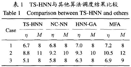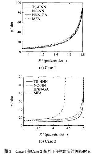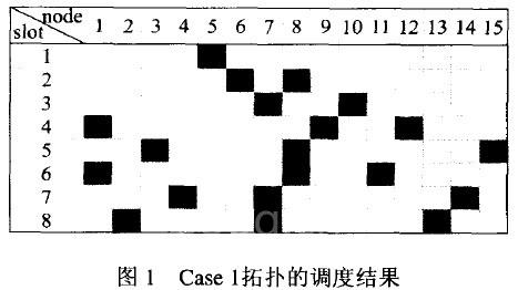 Step5 調(diào)度Q′中節(jié)點(diǎn)nj.搜索滿足2跳內(nèi)約束的時(shí)隙,記不同時(shí)隙數(shù)為Nc,依據(jù)Nc值分別執(zhí)行以下處理: ①若Nc>1,將第一個(gè)可用時(shí)隙指派給節(jié)點(diǎn)nj,Sij=1; ②若Nc=1,將該唯一時(shí)隙指派給節(jié)點(diǎn)nj,Sij=1; ③若Nc=0,則此時(shí)無(wú)空閑時(shí)隙指派給節(jié)點(diǎn)nj,轉(zhuǎn)Step7; Step6 判斷是否所有節(jié)點(diǎn)已完成調(diào)度.若P=N,算法停止;否則令P=P+1,轉(zhuǎn)Step5; Step7 新增一個(gè)時(shí)隙,重新調(diào)度.令M=M+1,轉(zhuǎn)Step5. 算法Step1排序的計(jì)算量為O(|N|),Step4排序的計(jì)算量為O(|N-Lm|3),N為網(wǎng)絡(luò)頂點(diǎn)數(shù),Lm是頂點(diǎn)最大度數(shù)加1,整個(gè)算法的計(jì)算量約為O(|N|3) 3.2 階段二 在階段二,使用模糊Hopfield神經(jīng)網(wǎng)絡(luò)對(duì)WSN網(wǎng)絡(luò)節(jié)點(diǎn)進(jìn)行模糊聚類[4、5] ,分類數(shù)為階段一中求得的M,輸入樣本為待調(diào)度節(jié)點(diǎn).同一類中的所有節(jié)點(diǎn)可以在同一個(gè)時(shí)隙同時(shí)被調(diào)度;不同類中的節(jié)點(diǎn)必須在不同時(shí)隙被調(diào)度.考慮N×M結(jié)構(gòu) Hopfield網(wǎng)絡(luò),節(jié)點(diǎn)i是否在第j個(gè)時(shí)隙傳輸數(shù)據(jù)由Hopfield處在(i,j)位置神經(jīng)元的輸出Pij確定.利用第2節(jié)中的約束條件來(lái)設(shè)計(jì)優(yōu)化目標(biāo),即Hopfield網(wǎng)絡(luò)能量函數(shù)E.首先,所有的數(shù)據(jù)包應(yīng)該在一個(gè)時(shí)隙內(nèi)同步傳送;其次,當(dāng)節(jié)點(diǎn)i時(shí)隙j傳輸數(shù)據(jù)時(shí),其他所有節(jié)點(diǎn)i的相鄰節(jié)點(diǎn)不能分配在時(shí)隙j;最后,當(dāng)節(jié)點(diǎn)i傳輸數(shù)據(jù)時(shí),i的二跳相鄰節(jié)點(diǎn)也不能被分配到時(shí)隙j去傳輸數(shù)據(jù).能量函數(shù)E大小反映網(wǎng)絡(luò)當(dāng)前時(shí)隙調(diào)度與最優(yōu)調(diào)度間差距,在考慮所有以上約束條件后,本文所設(shè)計(jì)能量函數(shù)E如下: ![]() 其中:ni表示第i個(gè)節(jié)點(diǎn),dij為節(jié)點(diǎn)i,j間歐氏距離,權(quán)值w1和w2為正且滿足w1+w2=l,權(quán)系數(shù)取值會(huì)影響網(wǎng)絡(luò)收斂性,需合理選?。甐i為第i類歐氏中心,即 ![]() Step1 初始化網(wǎng)絡(luò)內(nèi)神經(jīng)元(i,j)輸出Pij: ![]() Step2 更新模糊隸屬度函數(shù) ![]() Step3 由式(1)計(jì)算能量函數(shù); Step4 判斷網(wǎng)絡(luò)是否收斂于穩(wěn)定狀態(tài),若|E(n+1)-E(n)|〉ε(ε為閾值),轉(zhuǎn)Step2;否則,網(wǎng)絡(luò)收斂,算法終止. 4 實(shí)驗(yàn)結(jié)果與分析 對(duì)TS-HNN算法的調(diào)度性能進(jìn)行分析,與平均退火策略(MFA) [2] 、基于遺傳算法的Hopfield神經(jīng)網(wǎng)絡(luò)(HNN-GA) [4]和含噪混沌神經(jīng)網(wǎng)絡(luò)(NC-NN) [5]3種方法調(diào)度性能比較.使用3種不同拓?fù)涞臏y(cè)試網(wǎng)絡(luò)Case 1~3[6] . 實(shí)驗(yàn)中使用的數(shù)據(jù)包為固定長(zhǎng)度,時(shí)隙長(zhǎng)度設(shè)置為每包所需傳輸時(shí)間;節(jié)點(diǎn)問(wèn)以泊松分布隨機(jī)收發(fā)數(shù)據(jù)包.每種拓?fù)浣Y(jié)構(gòu)運(yùn)行50次,取平均值進(jìn)行比較.表1給出本文算法(TS-HNN)與其他3種方法求解得到的網(wǎng)絡(luò)最小延遲η和幀長(zhǎng)度M.在節(jié)點(diǎn)數(shù)較少(Case 1)或平均度數(shù)不高時(shí)(Case 3),4種算法都能找到最優(yōu)幀長(zhǎng)M=8;對(duì)于節(jié)點(diǎn)數(shù)較多具有復(fù)雜結(jié)構(gòu)網(wǎng)絡(luò)(Case 2),TS-HNN也能找到次優(yōu)幀長(zhǎng);且TS-HNN在3種拓?fù)湎露季哂凶畹偷木W(wǎng)絡(luò)時(shí)延.測(cè)試拓?fù)銫ase 1調(diào)度結(jié)果如圖l所示,填充有黑色的方格代表所在節(jié)點(diǎn)(node)在該時(shí)隙(slot)可被調(diào)度.圖2詳細(xì)描述了網(wǎng)絡(luò)時(shí)延隨數(shù)據(jù)包(packets)服務(wù)速率變化的情況.隨著服務(wù)速率增加,網(wǎng)絡(luò)時(shí)延也在變長(zhǎng),在節(jié)點(diǎn)數(shù)較少時(shí)(Case 1),4種算法的時(shí)延相差不大,如圖 2(a);當(dāng)節(jié)點(diǎn)數(shù)增加時(shí)(Case 2),4種算法下的網(wǎng)絡(luò)時(shí)延差異明顯增大,如圖2(b). ![]() ![]() ![]() 5 結(jié)束語(yǔ) 調(diào)度是一類經(jīng)典的帶約束資源優(yōu)化分配問(wèn)題本文以傳感器網(wǎng)絡(luò)為研究背景,提出了一種基于圖著色與神經(jīng)網(wǎng)絡(luò)的兩階段廣播調(diào)度算法.算法的基本思想是將廣播調(diào)度問(wèn)題求解轉(zhuǎn)化為兩階段目標(biāo)尋優(yōu):第1階段借助頂點(diǎn)著色思想搜索給定拓?fù)鋀SN的具有最短時(shí)隙數(shù)目的幀結(jié)構(gòu);第2階段在上述幀結(jié)構(gòu)下使用模糊Hopfield網(wǎng)絡(luò)為每個(gè)節(jié)點(diǎn)增添額外的無(wú)沖突傳輸時(shí)隙,從而使得在原有幀長(zhǎng)度下盡可能多的讓更多節(jié)點(diǎn)實(shí)現(xiàn)并行無(wú)干擾傳輸,以最大化信道利用率,仿真實(shí)驗(yàn)證明了所提方法的有效性. 參考文獻(xiàn): [1]PENG Y,SOONG B H,WANG ast scheduling in packet radio networks using mixed tabu- greedy algorithm[J].Electronics letters,2004,40(6):375-376. [2]WANG G,l broadcast scheduling in packet radio networks using mean gield annealing[J].IEEE Journal on Selected Areas in Communications.1997,15(2):250-260. [3]YEO J,LEE efficient broadcast scheduling algorithm for tdmad- hoc networks[J].