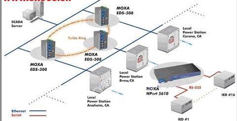 為了在低成本下向更多的客戶提供可靠的電力配送服務(wù),該公司開始擴(kuò)容自己電站的本地網(wǎng)絡(luò)子系統(tǒng)。使用小型SCADA系統(tǒng)集成和控制電力網(wǎng)絡(luò)、子站點(diǎn)和遠(yuǎn)端第二子站點(diǎn)到一個開放平臺。這個小型的SCADA系統(tǒng)需要工業(yè)級的以太網(wǎng)交換機(jī),與商業(yè)交換機(jī)相比有更高的可靠性,多串口聯(lián)網(wǎng)服務(wù)器,能夠連接和控制所有的IED(智能電力設(shè)備)到每個地點(diǎn)。