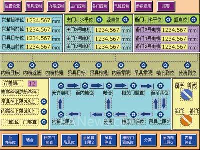 當(dāng)條件允許滿足內(nèi)箱運(yùn)動(dòng)到指定位置即低位,是否到低位由紅外開(kāi)關(guān)檢測(cè)。開(kāi)關(guān)分別裝在內(nèi)箱的4個(gè)角上,檢測(cè)信號(hào)進(jìn)入模擬量模塊04AD,用來(lái)判斷箱子下來(lái)的時(shí)候是否平直。到低位之后,氣缸齒合,相應(yīng)門(mén)豎直后,吊具可以帶上物件到指定位置,然后進(jìn)行回復(fù)運(yùn)動(dòng)。在傳送過(guò)程中,要頻繁地開(kāi)關(guān)門(mén),由于可能傳送一些帶輻射的物料,所以運(yùn)動(dòng)過(guò)程在一個(gè)密封罩內(nèi)進(jìn)行。