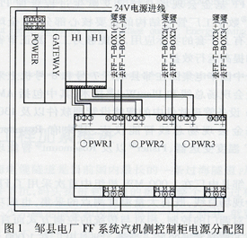 圖1所示為鄒縣電廠FF系統(tǒng)汽機側控制柜電源分配圖(ZouXian DCS FF Power Layout for Turbine),位于OVATION系統(tǒng)DROP6/56的擴展柜背面。