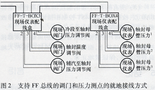 圖2所示是支持FF總線的調門和壓力測點的就地接線方式。其中傳輸線是來自OVATION系統(tǒng)DROP6/56的擴展柜背面、EXT6-lPWR3的FF-T-BOX3(+)端和FF-T-BOX3(-)端。