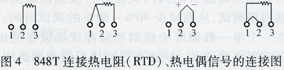 圖4所示為848T連接熱電阻(RTD)、熱電偶信號的連接圖。