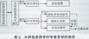 如圖2所示,當(dāng)通過現(xiàn)場總線控制系統(tǒng)檢測到化驗站各點水樣溫度都發(fā)生異常時,首先處理前臺部分的功能,如報警、使監(jiān)測界面的顏色發(fā)生改變等;同時,在后臺啟動指標(biāo)異常判斷數(shù)據(jù)庫和故障記錄庫、自動診斷庫等。其中,"指標(biāo)異常判據(jù)庫"的作用是提供診斷化學(xué)量參數(shù)異常的判斷內(nèi)容;后臺啟動的"故障記錄庫"的作用是自動記載化學(xué)指標(biāo)異常的日期、時間、故障表現(xiàn)及建議措施等,此項工作是在后臺自動運行,供日后用戶查詢時使用;"自動診斷庫"是在診斷過程自動發(fā)生后,存儲指標(biāo)異常判據(jù)結(jié)果的地方,該庫的作用是供日后或現(xiàn)場查看專家系統(tǒng)的診斷結(jié)果,整個專家系統(tǒng)的功能可以通過該庫的"診斷結(jié)果"域反映出來。