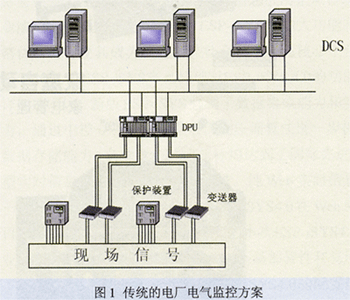 傳統(tǒng)的電廠電氣監(jiān)控的實現(xiàn)方式是由DCS系統(tǒng)經(jīng)I/O板實現(xiàn)對電氣部分的數(shù)據(jù)采集和遠方控制。電氣部分特殊控制功能如繼電保護、故障錄波等都由獨立的裝置來實現(xiàn),與DCS系統(tǒng)無關(guān)。圖1為傳統(tǒng)電廠電氣監(jiān)控方案,在這個方案中,DCS的I/O板只能處理標(biāo)準信號,模擬量需要經(jīng)過變送器轉(zhuǎn)換成標(biāo)準的4~20mA電流。DCS可以實現(xiàn)對電氣中的關(guān)鍵少量的信號的監(jiān)視和控制,但需要大量的電纜和變送器,實施的成本比較高。