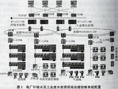 該系統(tǒng)選用西門(mén)子公司的PCS 7作為硬件平臺(tái),配置了2對(duì)冗余的主控制器CPU417H,分別用于鍋爐補(bǔ)給水系統(tǒng)、工業(yè)廢水系統(tǒng)。從控制室到現(xiàn)場(chǎng)的控制設(shè)備之間,完全采用現(xiàn)場(chǎng)總線通訊的方式,將水泵電機(jī)、風(fēng)機(jī)電機(jī)、加藥變頻器、氣動(dòng)電磁閥、氣動(dòng)調(diào)節(jié)閥、壓力變送器、流量變送器、液位變送器、化學(xué)分析等儀表和現(xiàn)場(chǎng)控制設(shè)備連在一起。所有的現(xiàn)場(chǎng)設(shè)備都具有數(shù)字通訊接口,控制室的指令和現(xiàn)場(chǎng)設(shè)備的狀態(tài)信息都通過(guò)現(xiàn)場(chǎng)總線進(jìn)行傳輸。