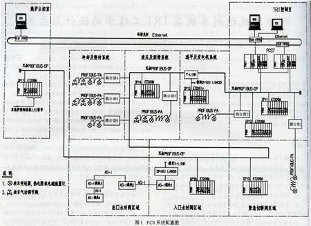 筆者在設(shè)計一鋼公司TRT工程中,根據(jù)煤氣差壓發(fā)電的特點,要求現(xiàn)場總線技術(shù)不僅成熟、可靠,還應(yīng)盡可能為冗余結(jié)構(gòu),以確保建TRT不影響主體高爐生產(chǎn)。因此通過對多家現(xiàn)場總線控制系統(tǒng)進行比較篩選,確定采用西門子公司的PROFIBUS、AS-I現(xiàn)場總線的組合以及相應(yīng)的儀表裝置,控制系統(tǒng)采用PCS7。FCS硬件主要由控制站、操作站和連接兩者及對外的通訊總絨構(gòu)成,具體配置如圖1所示。